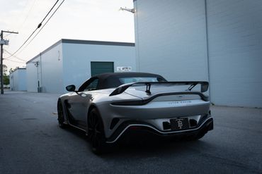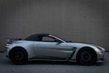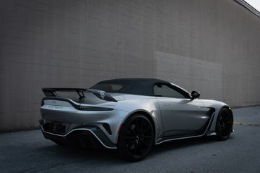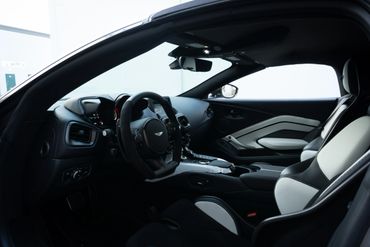 This 2023 Aston Martin V12 Vantage Coupe is powered by a twin-turbocharged 5.2-liter V12 paired with an eight-speed automatic gearbox. Equipment includes the Lightweight Package, a carbon-fiber clamshell hood, carbon-ceramic brakes, a limited-slip differential, 21″ wheels, a 360-degree camera, front and rear parking sensors, 16-way power-adjustable heated front sport seats, dual-zone automatic climate control, navigation, and an infotainment system with satellite radio capability and iPhone integration.