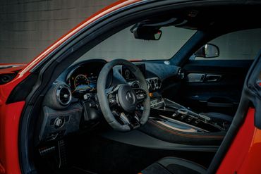 The cabin features heated and power-adjustable AMG performance seats trimmed in black Nappa leather upholstery with Dinamica synthetic suede inserts and contrasting orange stitching accompanied by a color-coordinated dashboard, center console, and door panels. Amenities include carbon-fiber trim, AMG-branded door sill panels, and a rear cross brace along with dual-zone automatic climate control, the Lane Tracking Package, Keyless Go, a Burmester High-End sound system, and COMAND infotainment with navigation and an optional touchpad.