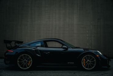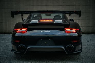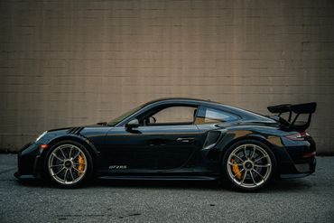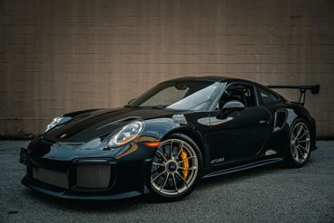 Weight savings were targeted with the GT2 RS program, and Porsche fitted multiple carbon-fiber components including the hood, front fender vents, side intakes, side mirrors, and rear wing. The Weissach Package reduces weight further through the use of carbon fiber for the roof panel and the anti-roll bars. Downforce is increased with a large rear wing, underbody diffuser, and a deeper front fascia, while NACA ducts in the front trunk lid aid in brake cooling. This example is finished in black and features LED headlights with Porsche Dynamic Lighting System (PDLS), fog lights, dual exhaust outlets, and fender vents. Paint protection film has been applied to the exterior.