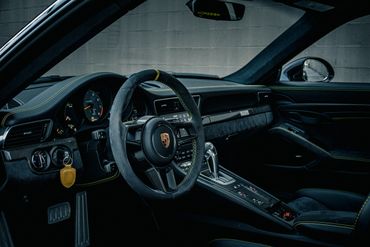 Staggered-diameter 20″ and 21″ magnesium center-lock wheels are mounted with Michelin Pilot Sport Cup 2 R tires measuring 265/35 up front and 325/30 at the rear. The car is equipped with adjustable dampers and anti-roll bars, Porsche Active Suspension Management, Porsche Stability Management, and rear-axle steering. Porsche Ceramic Composite Brakes were standard on the GT2 RS and feature yellow calipers and cross-drilled rotors. The optional front-axle lift raises the car on command to help prevent scraping.